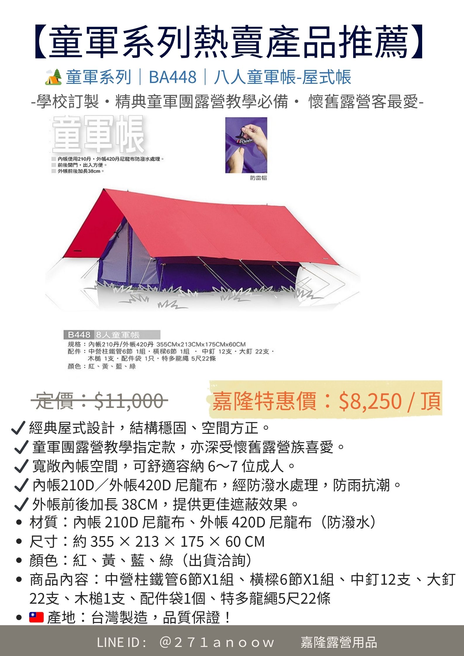 【JIALORNG 嘉隆】Chia Lung 嘉隆 童軍系列 八人童軍帳 屋式帳