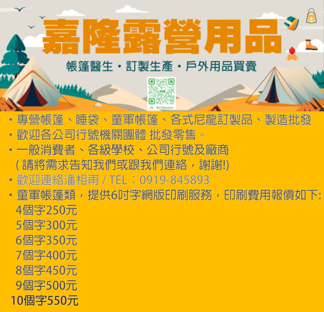 官方line ID: @276bawqn /@967yqucm(已滿) /嘉隆露營用品