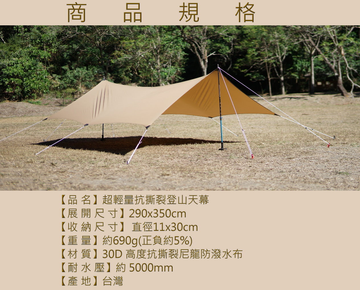 此款超輕量抗撕裂登山天幕 290x350cm,適合人數少,買來登山、露營或當車邊帳使用。