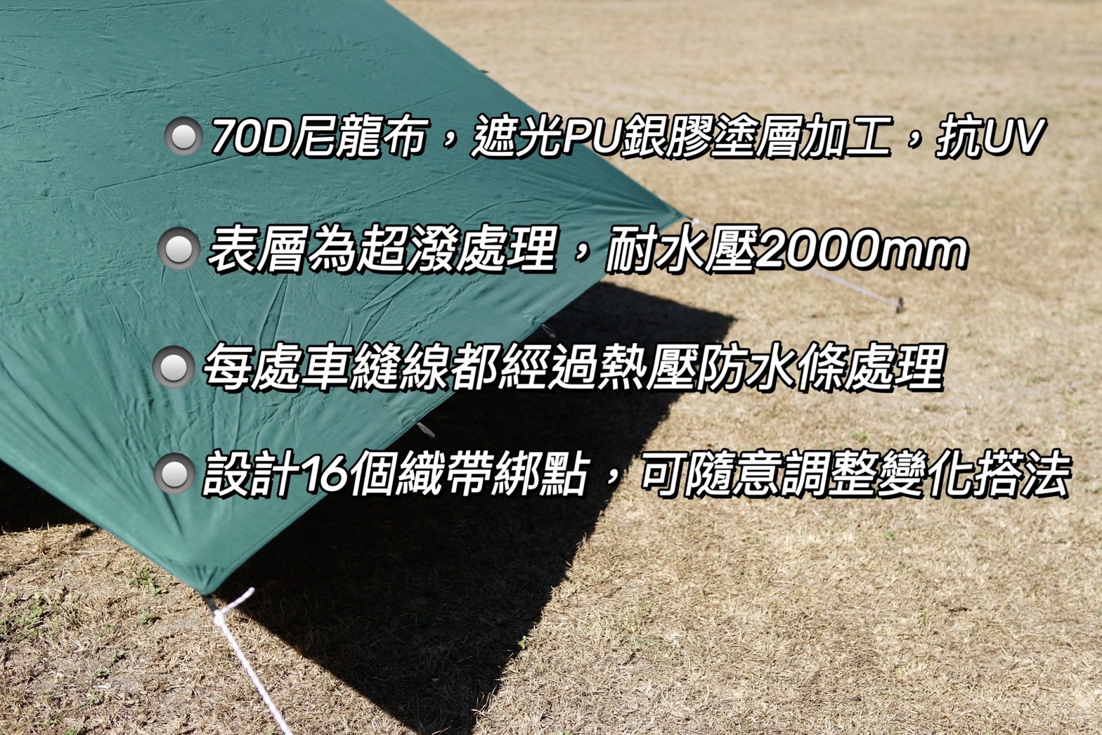 此款天幕設計16個織帶綁點,搭建方式多變化,可依氣候、地形來搭建最舒適的使用方式。