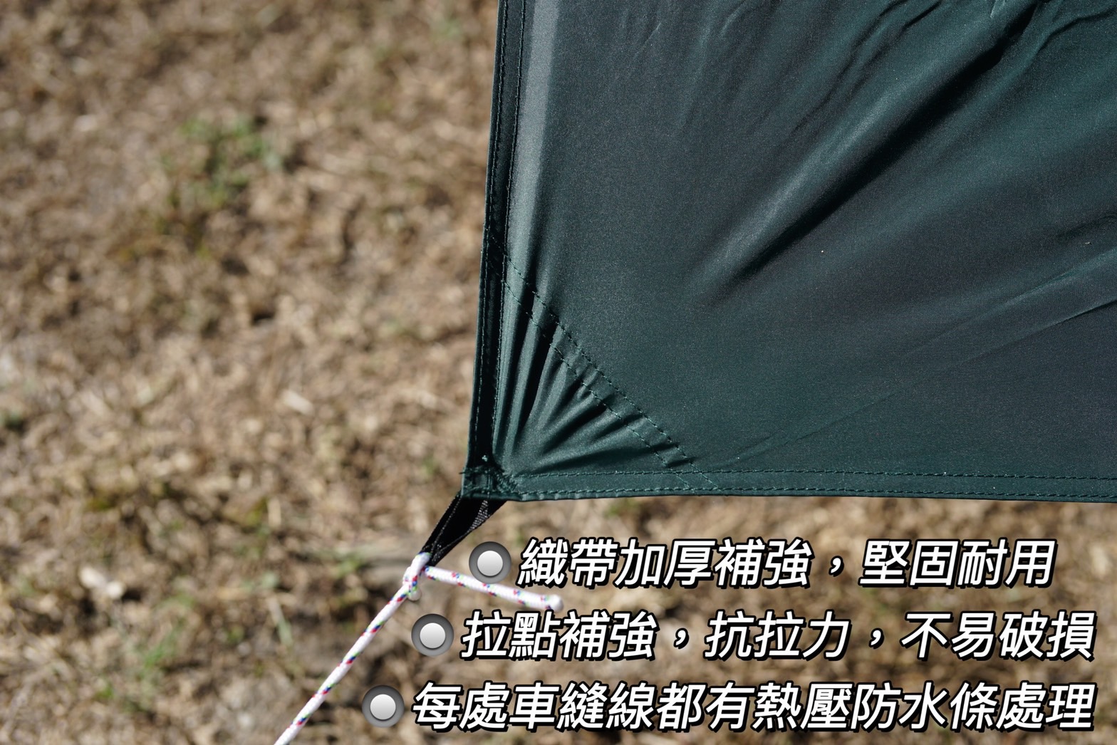 ● 適合搭建於小帳上方或當車邊帳使用,具擋風、遮陽效果,能延長帳篷壽命