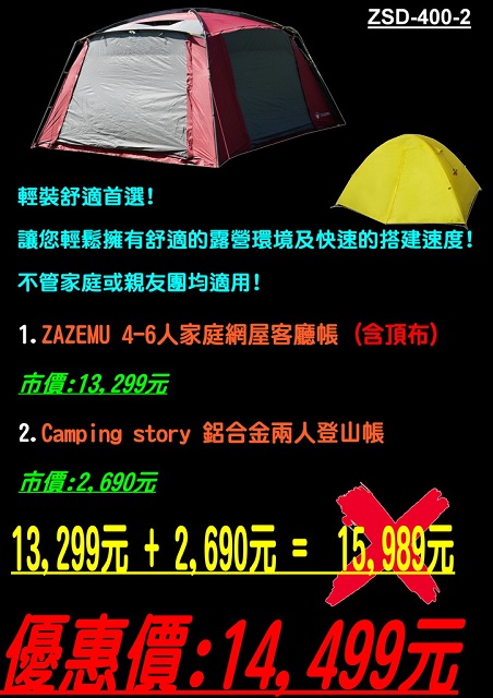 ZAZEMU ZSD-400-1 舒適4人客廳型睡帳(點我) + ZAZEMU ZSD-400-2 輕量2人客廳型睡帳(點我)+1,100