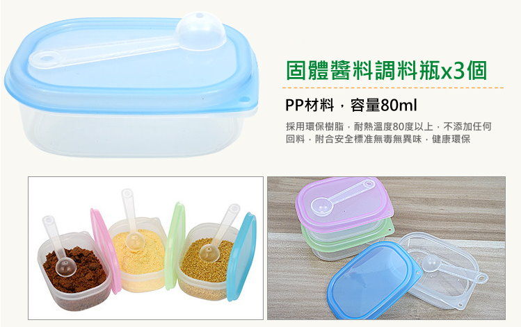 材質:液體瓶-PET、粉狀瓶-PET、醬料瓶-PP、收納包-600D加密牛津布