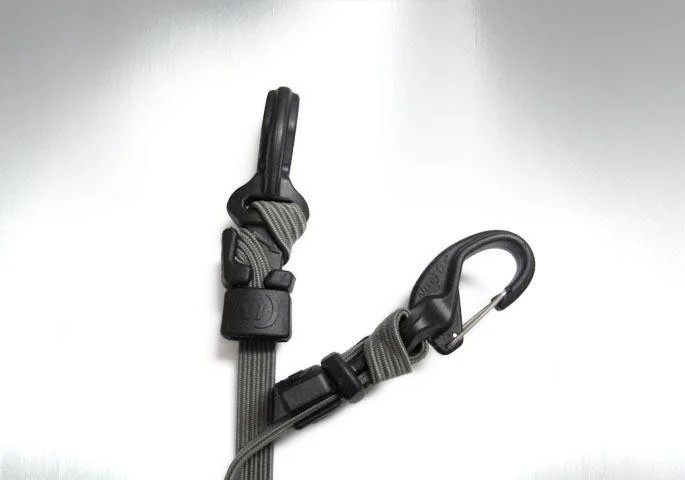 將您的物品以高強度彈力繩一端固定後,將另一端繩子尾端的扣繩扣解開,調整到您所需的緊度故讓物品牢固後,再將扣繩扣卡繩子上所需的位置上。