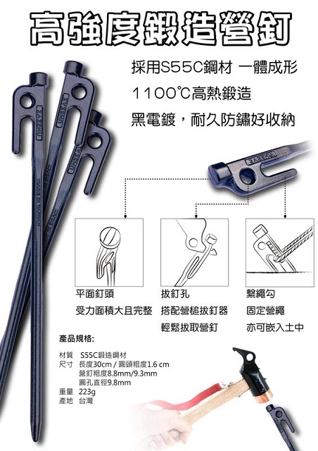 尺寸 (約) :長度30cm/圓頭粗度1.6cm 、營釘粗度8.8mm/9.3mm、圓孔直徑 9.8mm。