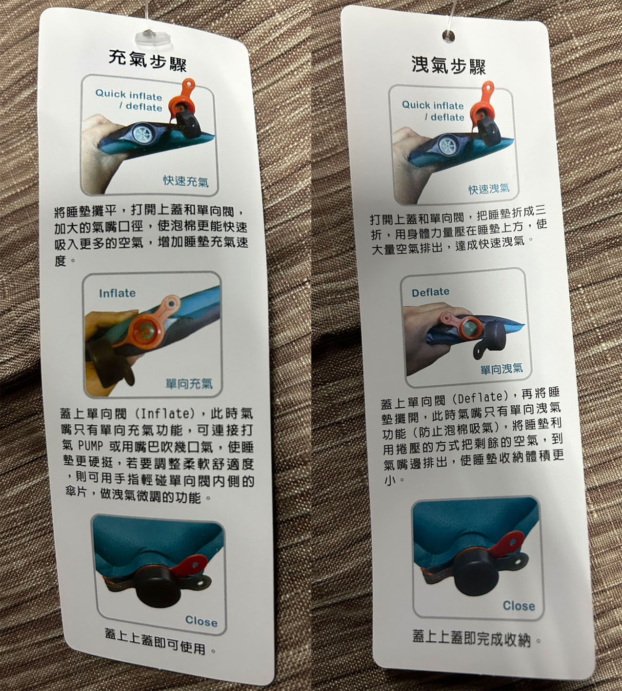 1. 充氣:將睡墊攤平,逆時鐘方向轉開睡墊的氣嘴,本產品將自動充氣。