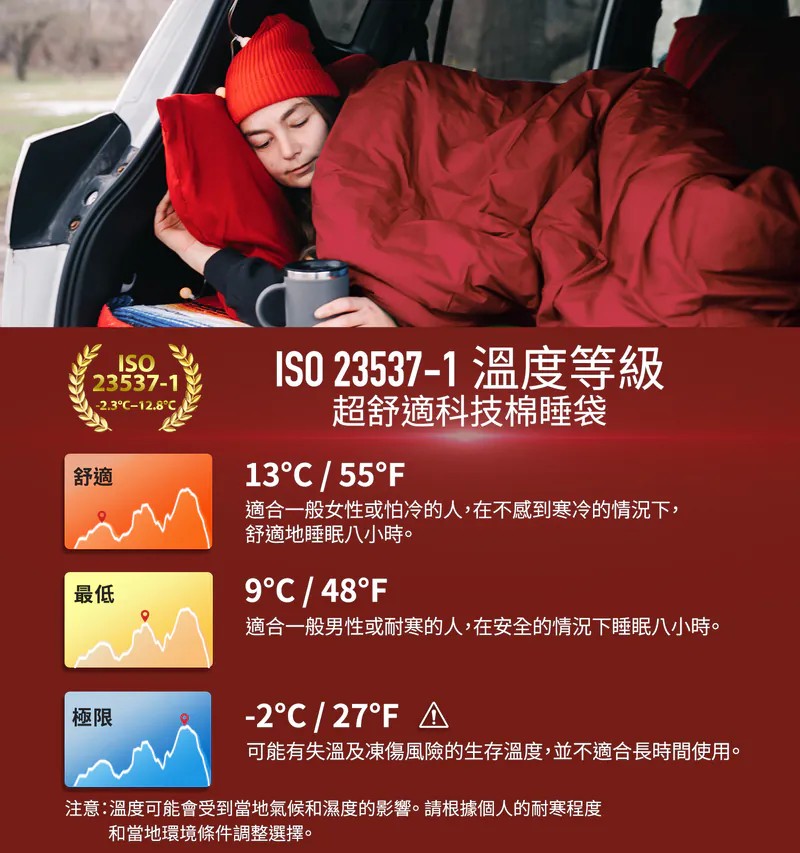 ISO 23537溫度評級:舒適 13°C , 最低 9°C , 極限 -2°C