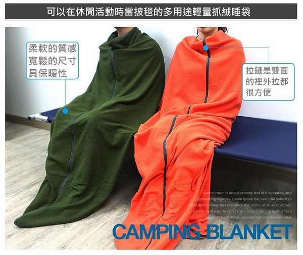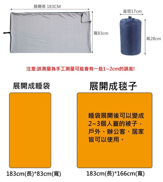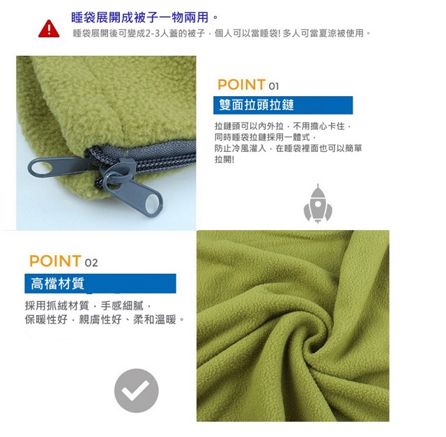 睡袋展開之後可變成2~3人蓋的毯子,可以是戶外露營的睡袋,居家的蓋毯、涼被,或者睡袋不夠暖加在睡袋裡增加保暖度,也可以是辦公午休的空調毯…等多功能睡袋內套。