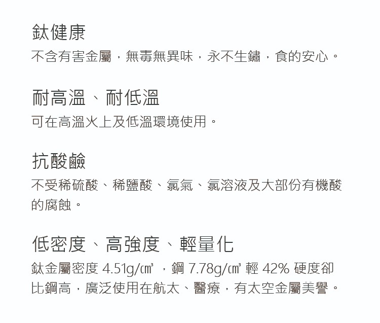 ● 鈦健康:不含有害金屬,無毒無異味,永不生鏽,食的安心