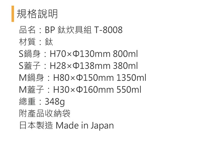 材質:鈦/雙夾把手/2鍋2蓋 348g