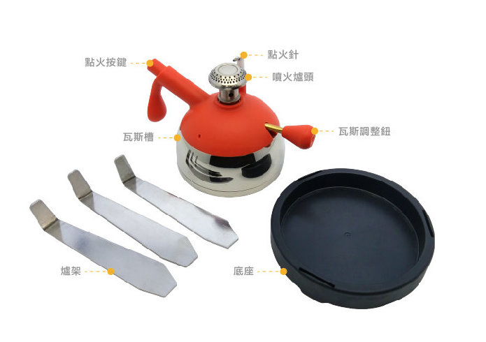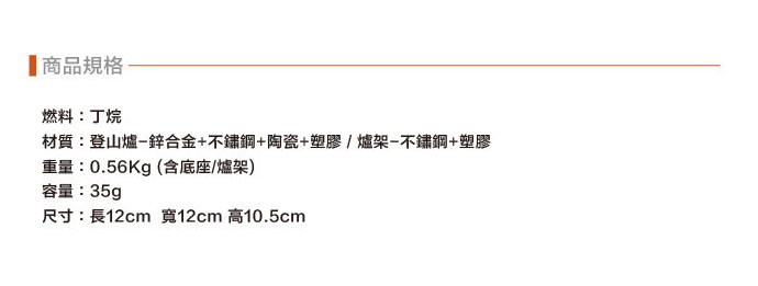 材質:登山爐-鋅合金+不鏽鋼+陶瓷+塑膠 / 爐架-不鏽鋼+塑膠