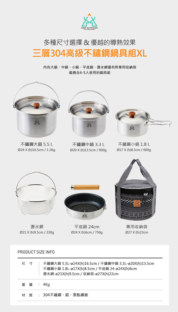 品名 : KAZMI KZM 三層304高級不鏽鋼鍋具組XL