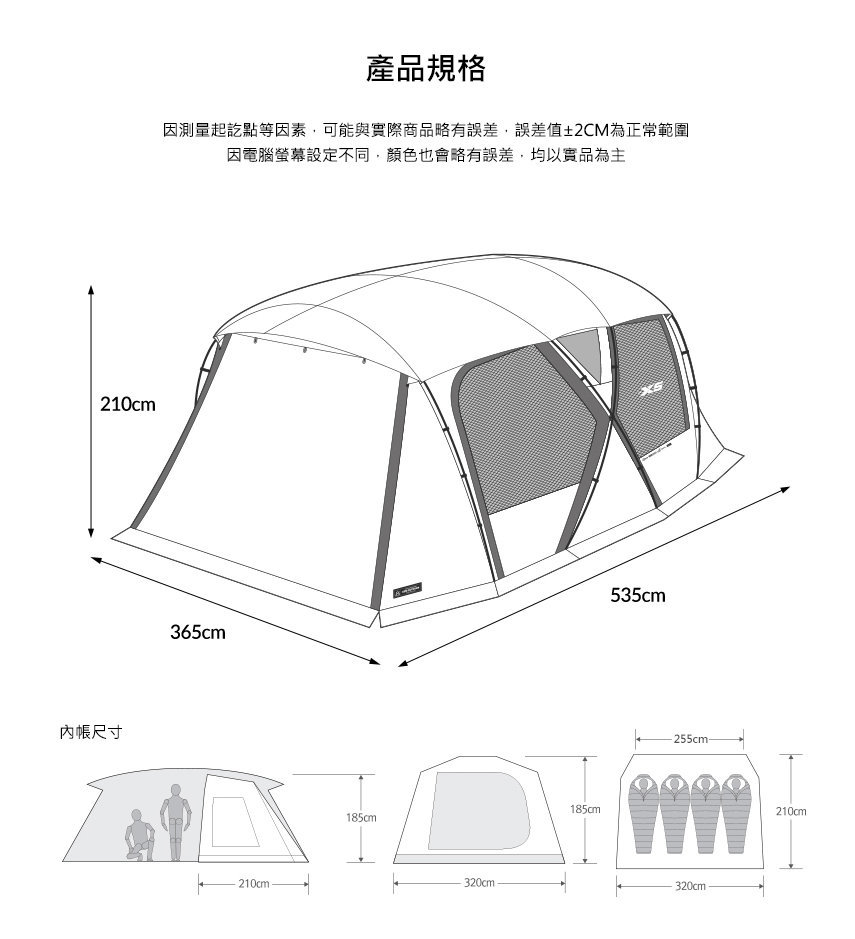 尺寸 : 搭設時-535x365x(h)210cm/收納時-80x33x33cm/內帳-前門(長邊320)/後門(短邊)255x210x(h)185cm