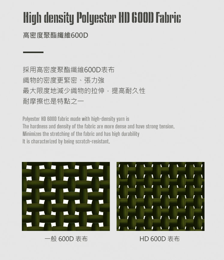 ● 採用高密度聚酯纖維600D表布,織物的密度更緊密、張力強。