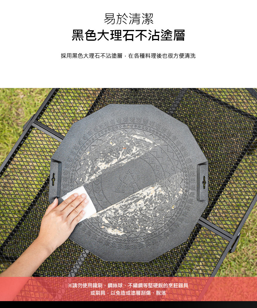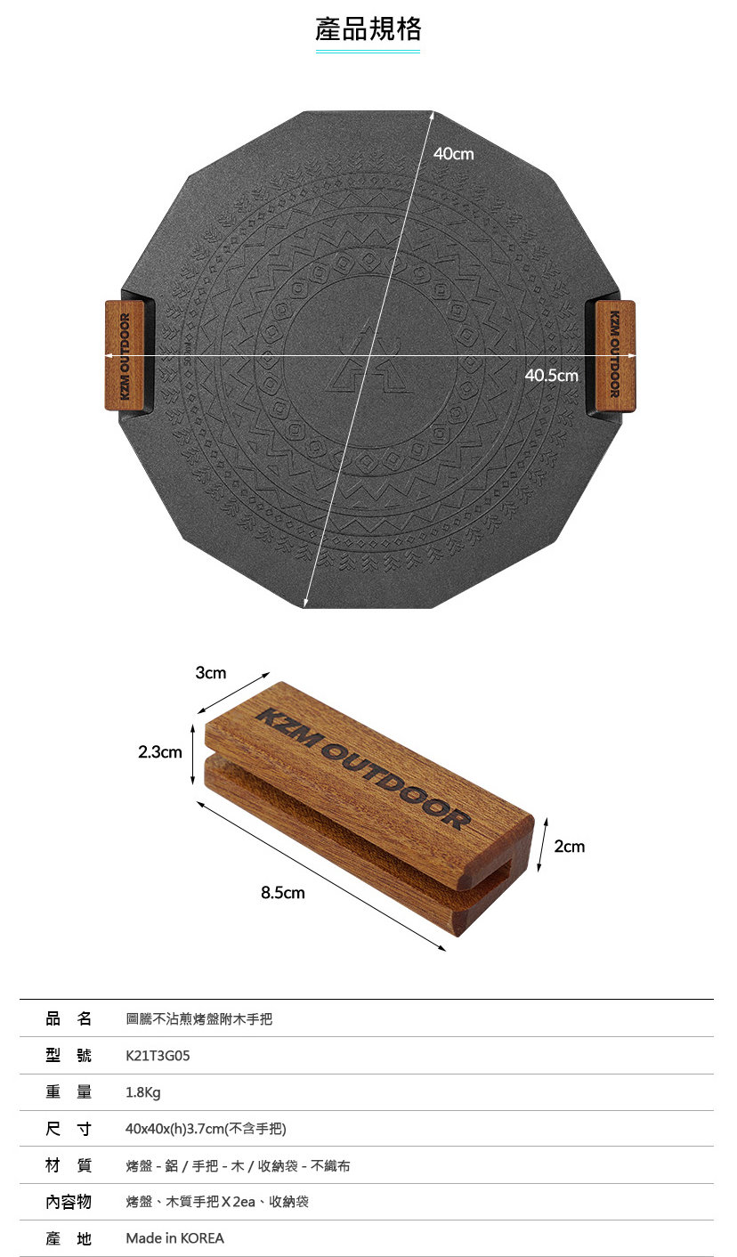 ● 擺脫了圓形外觀,製作成12邊形的獨特形狀,刻有經典圖騰及KZM LOGO,是一款全新設計的烤盤