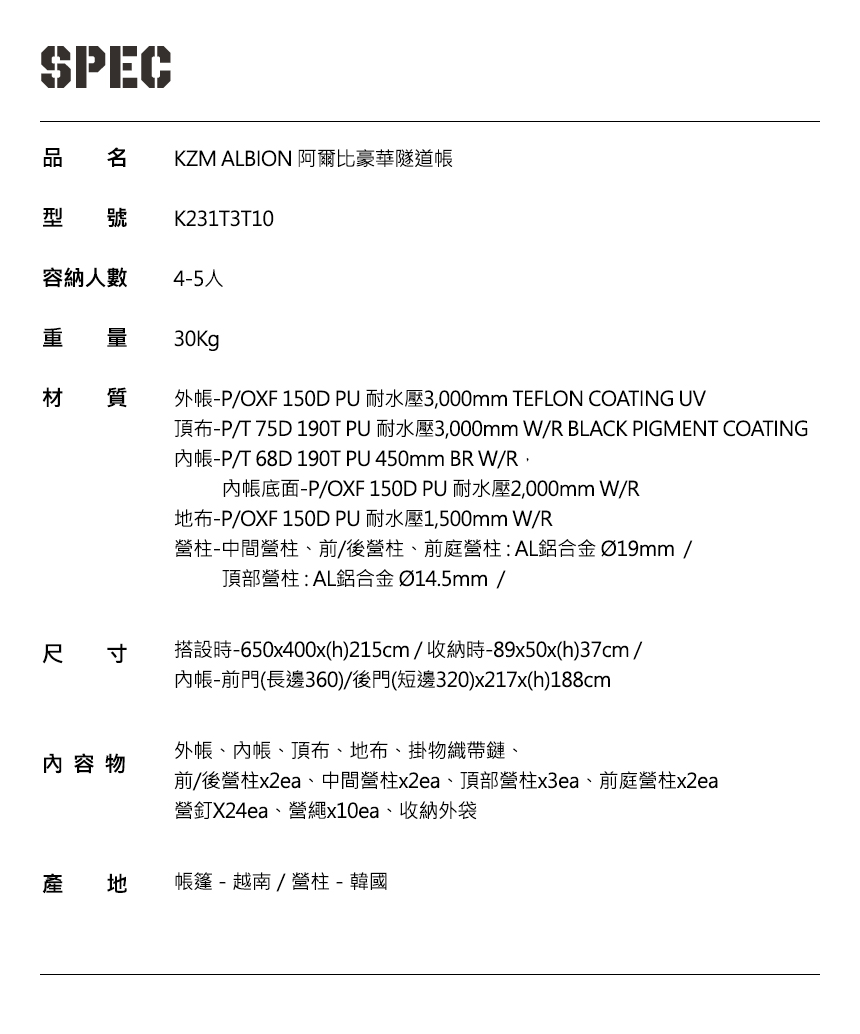 品名 : KZM ALBION 阿爾比豪華隧道帳 買就送阿爾比豪華隧道帳專用掛窗
