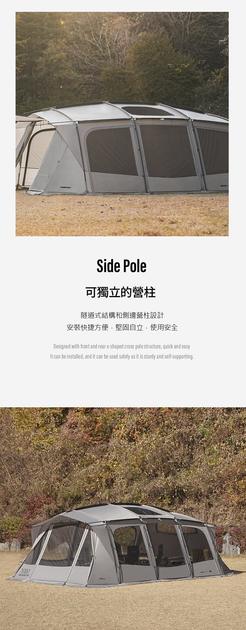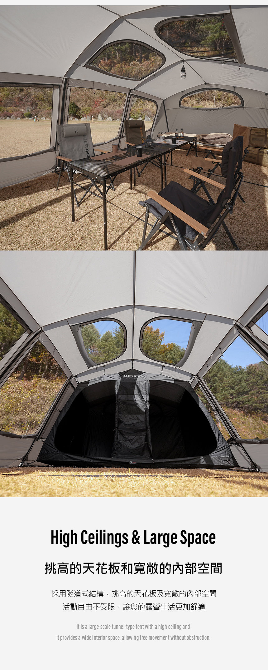 ● 採用隧道式結構,挑高的天花板及寬敞的內部空間,活動自由不受限,讓您的露營生活更加舒適