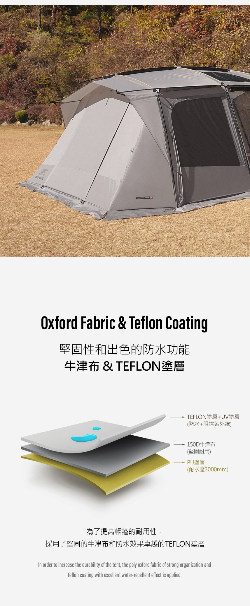 ● 為了提高帳篷的耐用性,採用了堅固的牛津布和防水效果卓越的TEFLON塗層