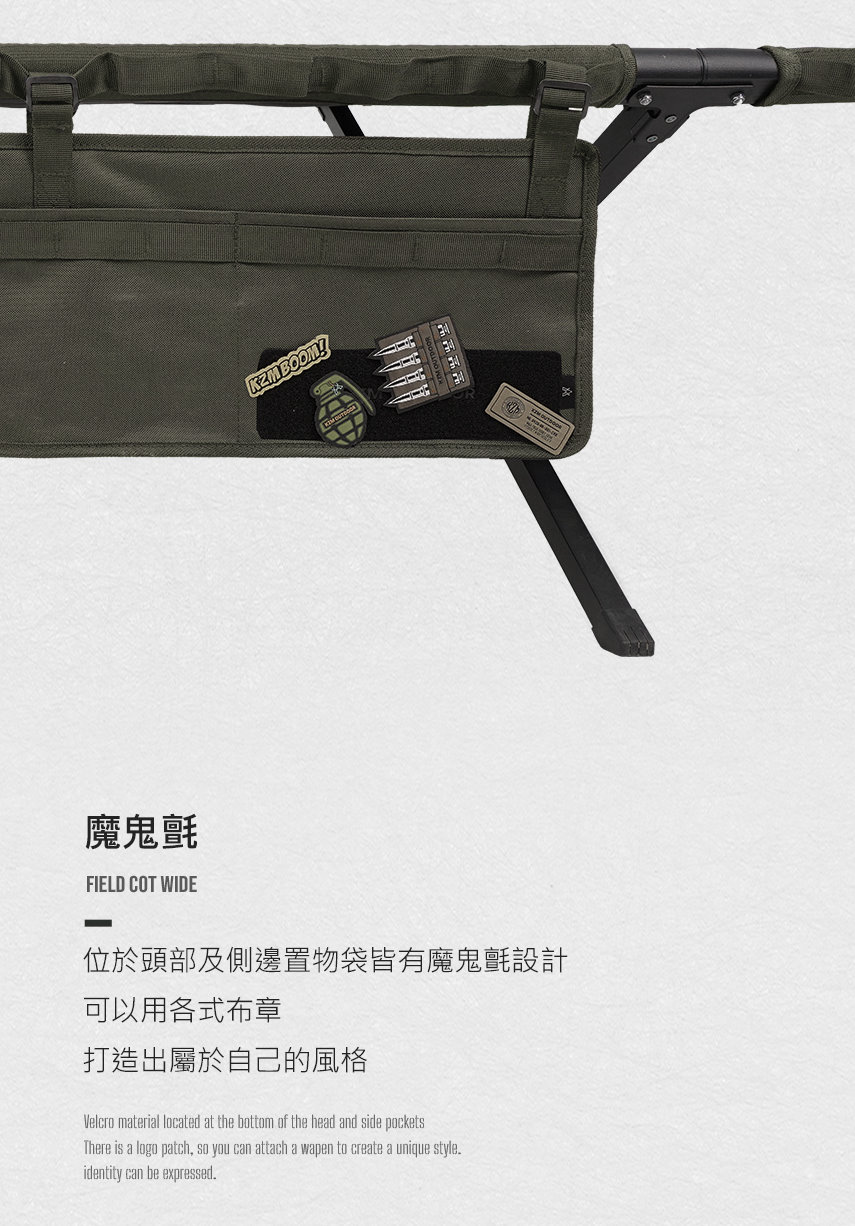 ● 位於頭部及側邊置物袋皆有魔鬼氈設計,可以用各式布章,打造屬於自己的風格