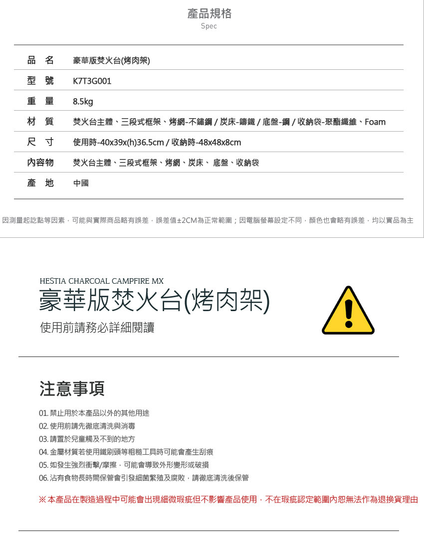材質 : 焚火台主體、三段式框架、烤網-不鏽鋼/炭床-鑄鐵/底盤-鋼/收納袋-聚酯纖維、foam
