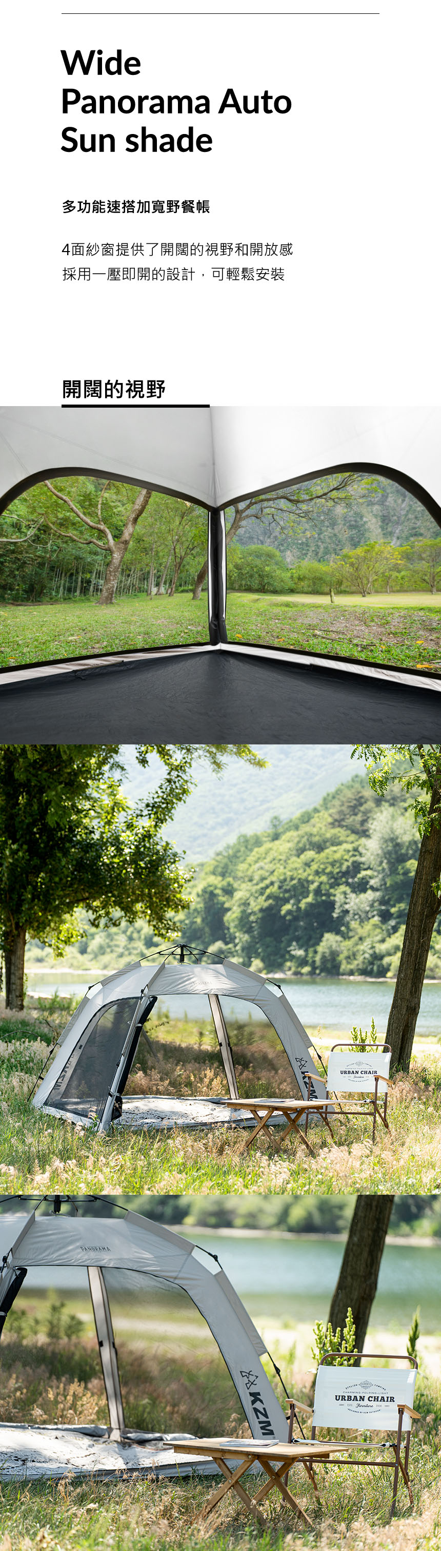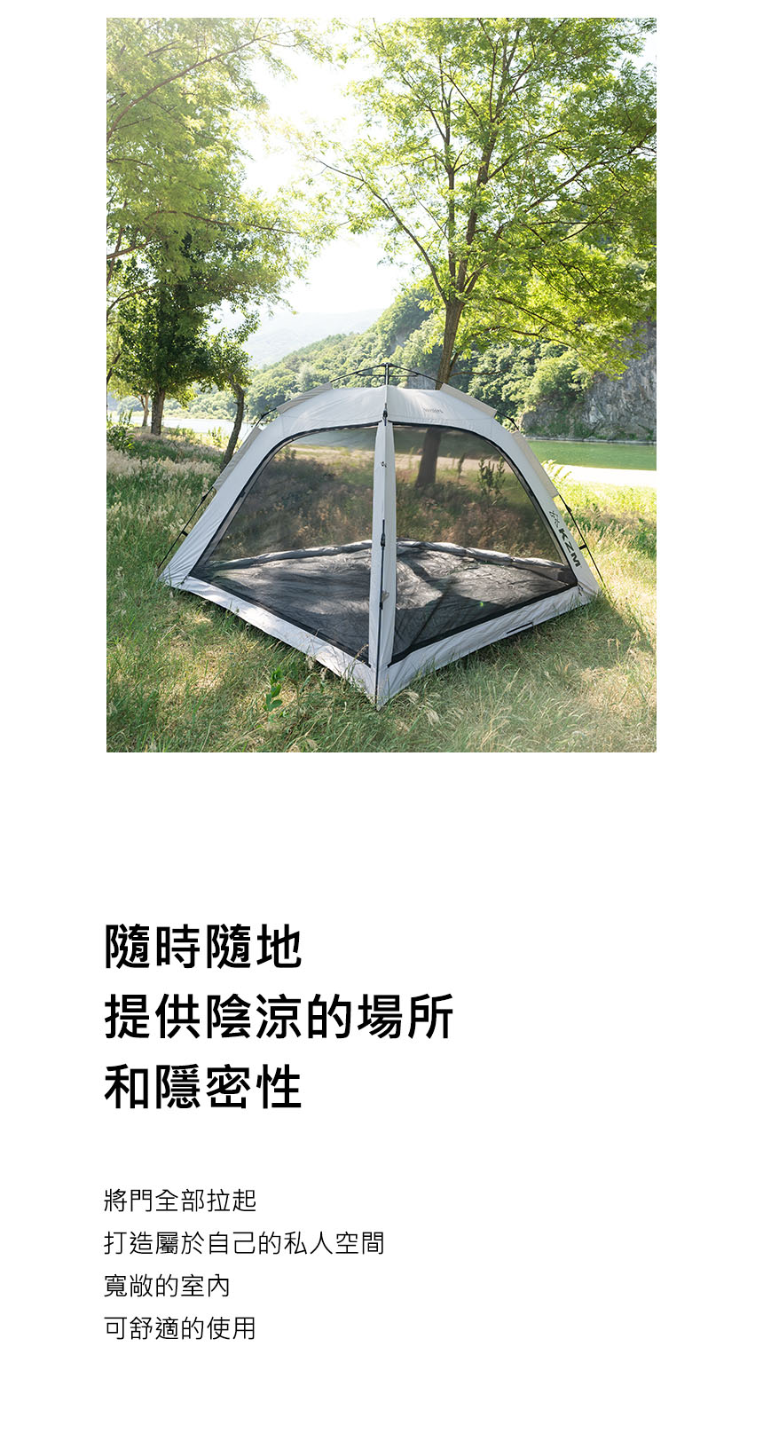 ● 多功能速搭加寬野餐帳 : 四面紗窗提供了開闊的視野和開放感,採用一壓即開的設計,可輕鬆安裝