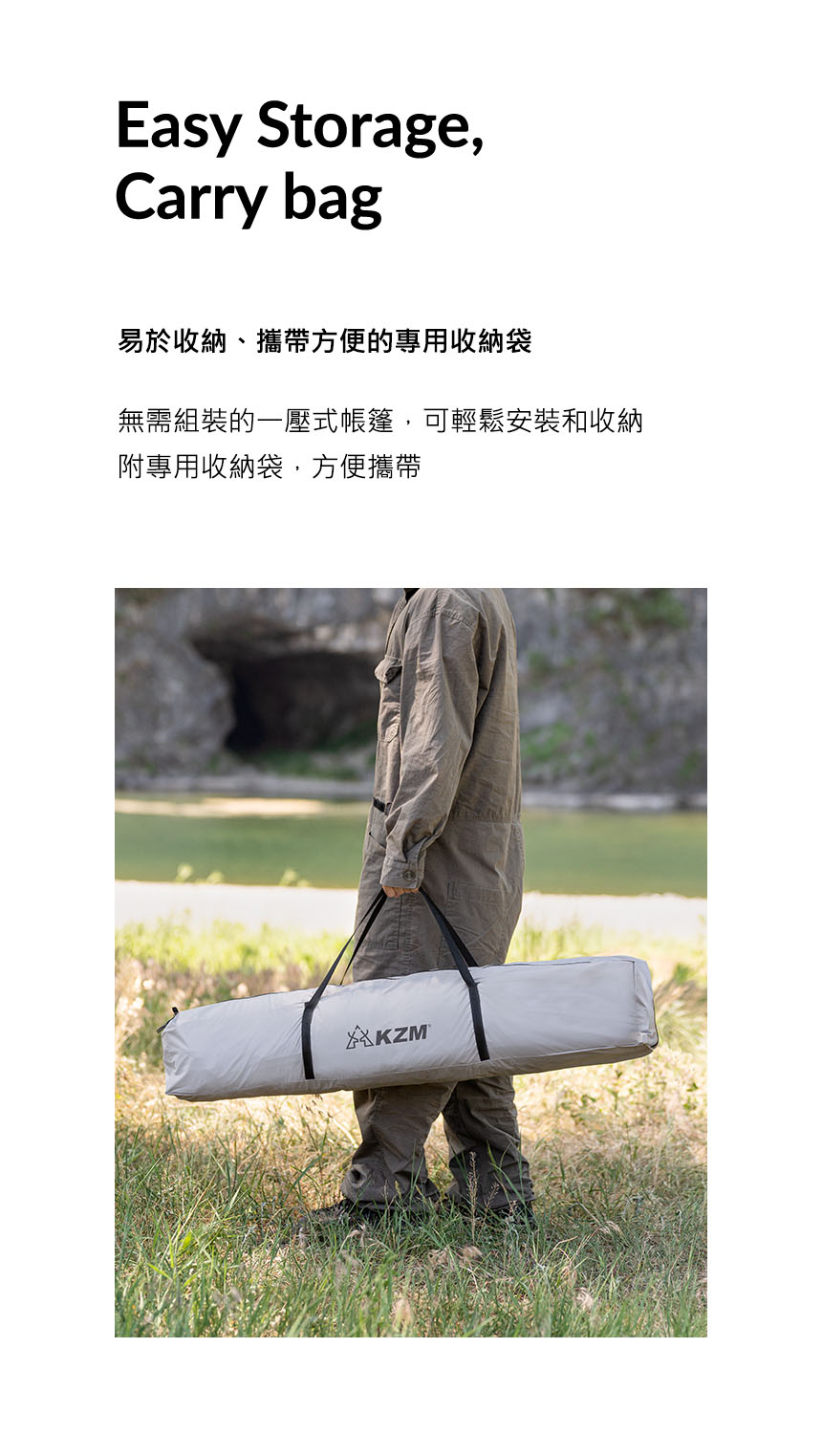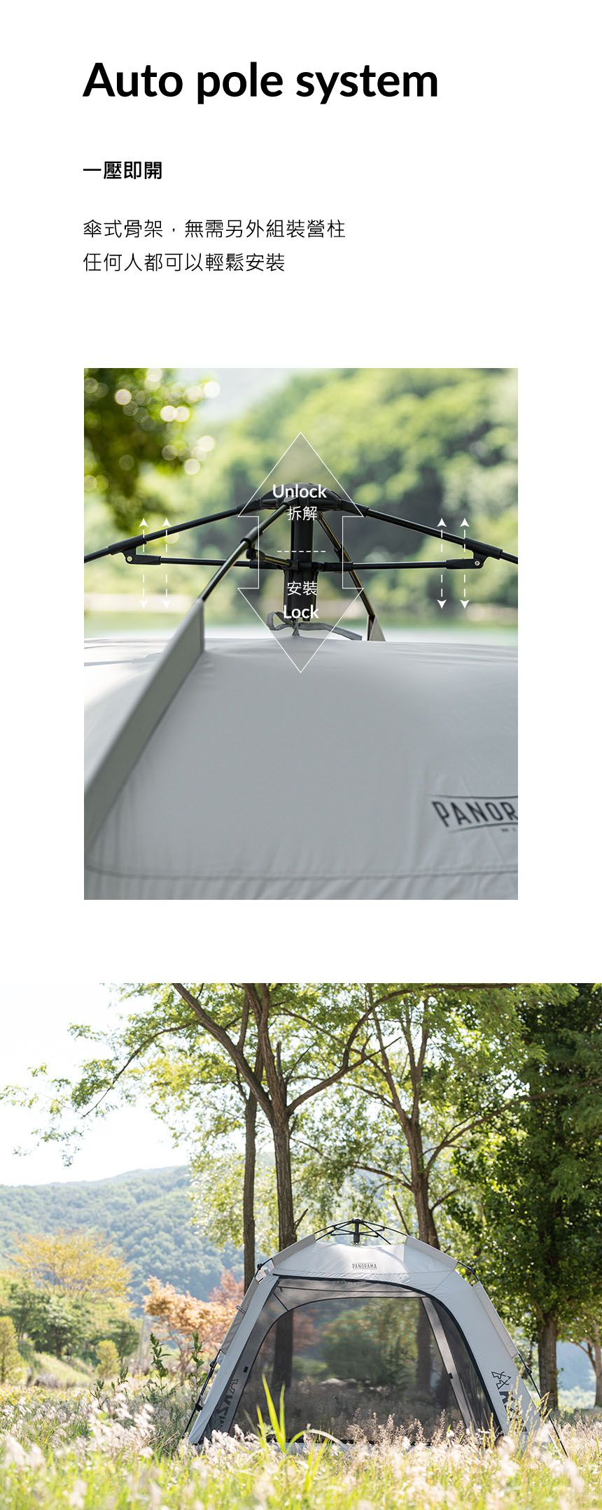● 一壓即開:傘式骨架,無需另外組裝營柱,任何人都可以輕鬆安裝