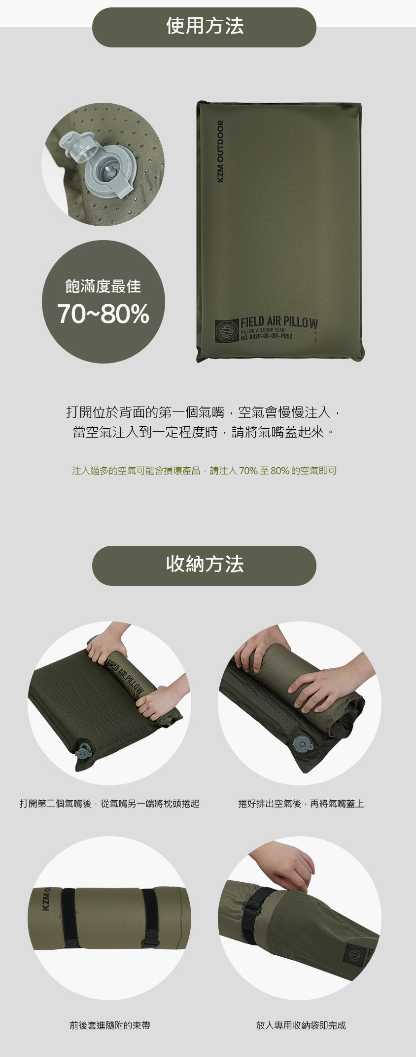 【JIALORNG 嘉隆】KZM 輕柔舒眠自動充氣枕(軍綠) 充氣枕頭 露營枕頭 收納枕